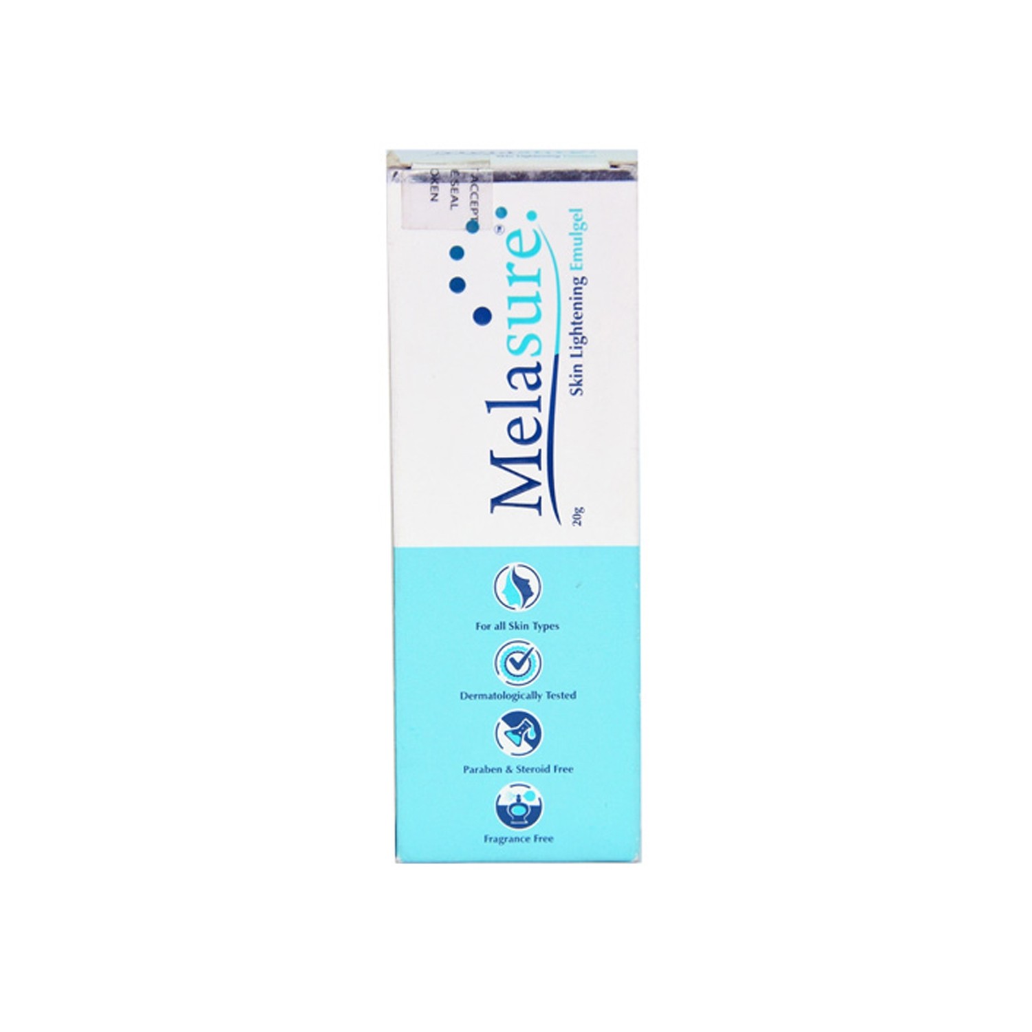 Melasure Skin Lightening Emulgel Melasure Skin Lightening Emulgel is specifically designed to help provide a glowing skin as well as lighten one's skin tone. No amount of steroids have been added to achieve this result. The mulberry extract in it is a rich source of antioxidants and it protects the skin cells from damage caused by harmful free radicals.